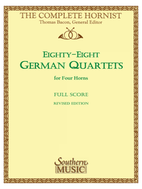 Description: It is with great pride that Southern Music Company and The Complete Hornist present this wonderful collection of 88 German hom quartets. Originally edited by Heinz Liebert and published by Hofmeister of Leipzig, it includes hunting tunes, waltzes, lieder, opera excerpts, folk songs, hymns, Christmas pieces, and marches. Composers include von Weber, Mendelssohn, Schumann, Mozart, Schubert, Gluck, Kuhlau, Brahms, Beethoven, Handel, Wagner, Johann Strauss, and many more. The fourth horn part is available in both old notation bass clef and in treble clef.