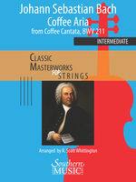 Description: Written between 1732 and 1735, J.S. Bach’s COFFEE CANTATA is one of his few secular cantatas. ARIA No. 8, is joyous and uplifting; a wonderful example of the mature baroque compositional style. The plot of the CANTATA centers around Lieschen (soprano), who vows to her father that she will give up drinking coffee if she can find true love. Scored for intermediate string orchestra at a medium difficulty, this arrangement uses many of the voicings of the original score, but has been shortened to keep the performance time at a manageable length. Suggested dynamics, articulation and bowings have been included for ease of performance.