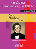 Description: The String Quintet in C major (D.956, Op. Posth. 163) is Schubert’s final chamber work. It is sometimes called the Cello Quintet because unlike the standard string quintet, which includes an extra viola, this work adds an extra cello. Completed just two months prior to the composer’s death, it did not receive its first performance until 1850. The third movement Scherzo – itself close to eleven minutes in length – comprises two large sections, with a repeat of the first section to create a “fast-slow-fast” format. This version for advanced string orchestra condenses the performance time to about five minutes while retaining all the essential melodic mastery of Schubert.