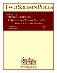 Description: These two selections by two different composers are strikingly individual while having a number of features in common: they are of about equal length, are serious and eloquent in character, and were written during the final portion of their respective creative periods. “Christus Factus Est” (Christ Became Man for Our Sake) was written by Anton Bruckner for unaccompanied chorus and exhibits many traits of the composer’s mature style: chromaticall shifting harmonies, square-cut phrases often ending in moments of silence, and moods alternating between exaltation and serene contemplation. “Andante Festivo” by Jean Sibelius was written originally for string quartet, then expanded for full string orchestra. One of his last completed works, it took on partriotic significance after Russia invaded Finland in 1939. This flexible arrangement for band by Richard Thurston have been scored so that they may be performed by the woodwind choir of the band alone, brass choir and timpani alone, or by the full band, leaving interpretive tastes to the conductor as well as being adaptable to the abilities of the instrumental forces available.